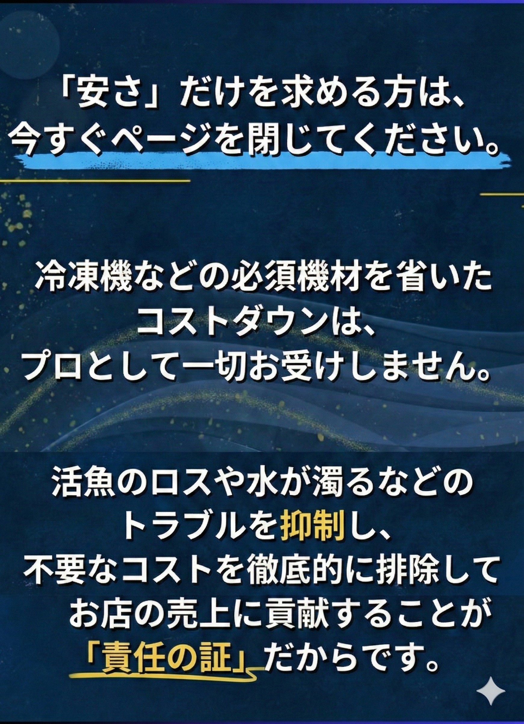 また、活魚水槽でどのくらい『費用対効果』を出せるかなどもご説明いたします。